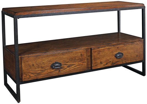 #The distressed finish and vintage touches of this entertainment console give it a rustic look and feel. Simple lines and design only add to its alluring nature. It features one fixed shelf and two felt lined drawers for storage.