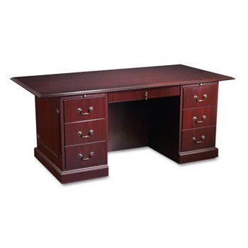 NEW - 94000 Series Double Pedestal Desk, 72w x 36d x 29-1/2h, Mahogany - 94271NN?18th century elegance, 21st century engineering. Traditional style with distinctive plinth base and antique brass-plated hardware. Mirror-finish, high-pressure laminate top for ease of care. Woodgrain laminate end panels and drawer fronts. Drawers operate on ball bearing suspensions; file drawers extend fully and accommodate letter or legal size hanging files, box drawers extend three-quarters. Center drawer with central locking system locks all drawers. Color: Mahogany; Pedestal Count: 2; Top Shape: Rectangular.