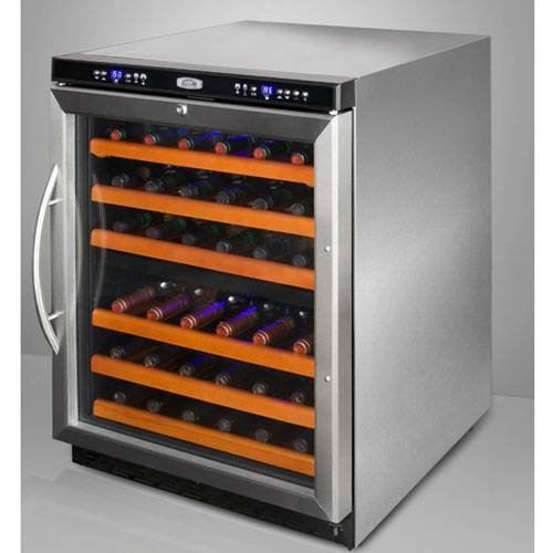 Summit SWC530LBICSS 24" Built In Dual Zone Undercounter Wine Cellar with Stainless Steel Cabinet . Store your finest collection in the SWC530LBICSS, an undercounter wine cellar with advanced features and stunning design. Two digital thermostats allow you to chill your white wine while separately preserving red at a warmer temperature. Slide-out wooden shelves display up to 36 bottles, with extra storage space to accommodate a total of 46 bottles. Full automatic defrost, interior lighting, andSUMMIT's own "hidden" evaporator help to keep use and maintenance simple. The SWC530LBICSS's cabinet is fully wrapped in stainless steel, with a stainless steel handle over the glass door. Fully front breathing with a flush back, this model can function as a free-standing or Built-In unit in any home with a taste for modern luxury.Built-In capable - Make the best use of space by installing your appliance under the counter and flush with other cabinetry Fully wrapped stainless steel cabinet - Complete stainless steel exterior enhances any room with modern luxury Two digital thermostats - Set and adjust two temperature zones separately with easy-to-use digital controls and digital displays Two temperature zones - Lower zone for reds has a temperature range of 10 C 50 F to 18 C 64 F Upper zone stores whites and sparkling wine between 5 C 40 F to 10 C 50 F Automatic defrost - Save time and worry by letting your appliance do its own defrosting Six slide-out wooden shelves - Conveniently access your bottles with smooth slide movement. Wooden construction gives the interior a classic touch Interior light - Illuminate your collection with a subtle blue hue Stainless steel door frame and handle - Style and substance outline your unit with a professional look Black interior liner - Simple to clean and sophisticated in style Key lock - Keep your cooler secure with a front lock 100% CFC free - Environmentally friendly design does not contain ozone-damaging chemicals 1 Year Parts Labor Warranty 5 Years Compressor WarrantyAmps: 2.0 Canadian Electrical Safety: CSA Capacity (cu. ft.): 5.2