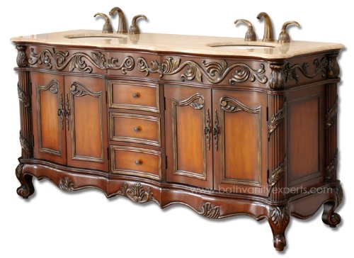 #The Haywood Double Bathroom Vanity has a traditional antique look with ornate molding throughout. One center column of drawers and dual cabinet doors open to large interior storage with one shelf on each side. The trim and leaf scrolls display exquisite beauty in addition to corner column pillars with winding vines and leaves. With outward claw feet and deep cut decorative base the beauty stands out. Trim on the doors add visual depth creating a designer style piece you will fall in love with. Copper handles and pulls and brass hinges accent the rich finish and timeless design of this cabinet. At 72 inches wide, this vanity can be used in numerous bathroom spaces. Please check out our large selection of faucets available at additional cost to complete your new vanity. Finished with a French edge around the exterior and bowl openings, the top is available in Travertine Stone or Baltic