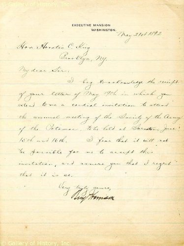 PRESIDENT BENJAMIN HARRISON - MANUSCRIPT LETTER SIGNED 05/21/1892